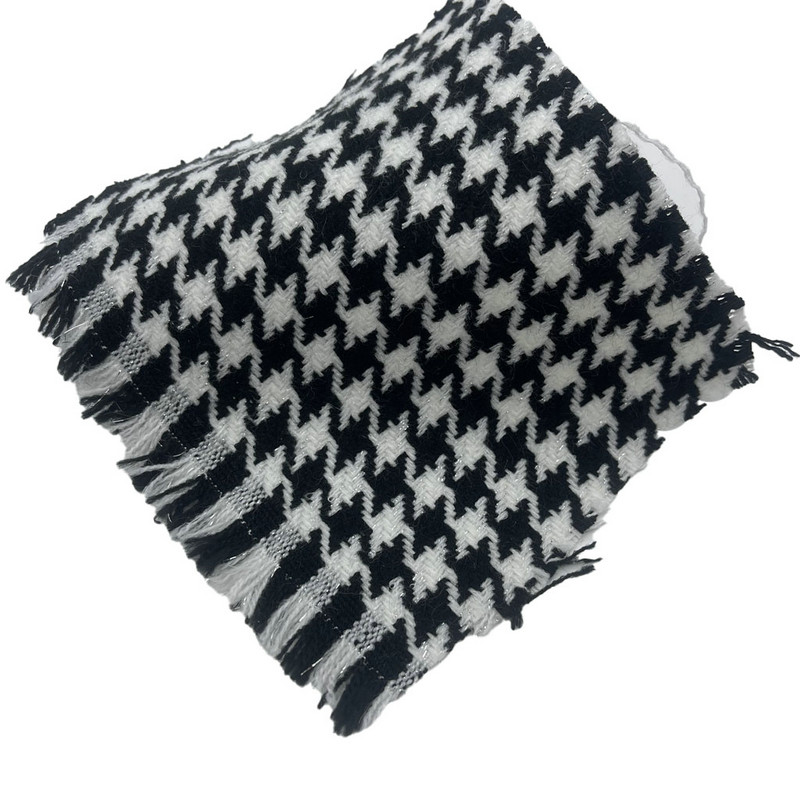 Ang telang ito ay isang jacquard tweed textile na binubuo ng 97% na acrylic at 3% na pilak na sinulid, na may mass bawat unit na 250 gsm. Nagtatampok ito ng itim at puting houndstooth pattern na isinama sa mga elementong metal sa panahon ng proseso ng paghabi ng jacquard. Ang acrylic base ay nagbibigay ng structural consistency at color retention, habang ang silver thread ay nagpapakilala ng light-reflective properties sa pattern. Ang konstruksiyon na ito ay lumilikha ng isang tela na may mga tinukoy na geometric na motif at contrast sa ibabaw. Ang tinukoy na timbang at komposisyon ay nakakatulong sa tibay ng materyal at kadalian ng pagpapanatili. Ginagawa ng mga teknikal na katangiang ito na naaangkop ang jacquard tweed na ito para sa mga proyekto ng upholstery kung saan kinakailangan ang pattern visibility at functional performance.