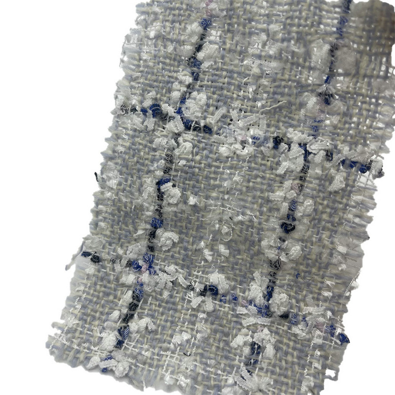 Ang telang ito, na itinalaga bilang artikulo 23510, ay isang tweed textile na binubuo ng 45% wool at 55% polyester. Sa isang mass sa bawat unit area na 425 gsm, ito ay nagpapakita ng katamtamang timbang na konstruksyon na angkop para sa mga coats. Nagtatampok ang tela ng asul, grey, at puting plaid na pattern, na isinama sa butterfly motif sa panahon ng proseso ng paghabi. Ang kumbinasyong ito ay lumilikha ng isang layered visual effect sa loob ng istraktura ng tela. Ang pinaghalong lana at polyester ay nakakatulong sa dimensional na katatagan at thermal properties ng tela. Ginagawa ng mga teknikal na katangiang ito na naaangkop ang tweed na ito para sa mga damit na panlabas kung saan kinakailangan ang pagiging kumplikado ng pattern at integridad ng istruktura.