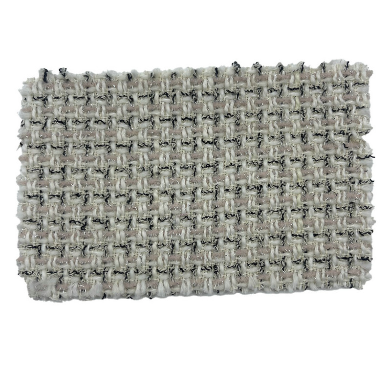 Ang telang ito, na itinalaga bilang artikulo 23523, ay isang tweed textile na binubuo ng 78% polyester, 12% wool, at 10% cotton. Sa isang mass bawat yunit na lugar na 440 gsm, ito ay nagpapakita ng isang katamtamang timbang na konstruksyon na angkop para sa mga damit. Nagtatampok ang light pink na base ng check pattern na isinama sa metal na sinulid sa panahon ng proseso ng paghabi. Ang kumbinasyong ito ay lumilikha ng kaibahan sa parehong visual na hitsura at liwanag na pagmuni-muni. Ang timpla ng polyester, wool, at cotton ay nakakatulong sa dimensional stability, thermal regulation, at moisture management ng tela. Ginagawa ng mga teknikal na katangiang ito na naaangkop ang tweed na ito para sa mga fashion dress kung saan kinakailangan ang pagtukoy ng pattern at pagganap ng materyal.
