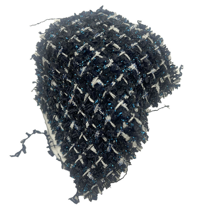 Ang telang ito, na itinalaga bilang artikulo 23511, ay isang check tweed textile na binubuo ng 86% polyester at 14% na nylon. Sa isang mass per unit area na 340 gsm, ito ay nagpapakita ng magaan na konstruksyon. Ang madilim na asul na base ay nagsasama ng isang asul na metalikong sinulid sa loob ng pattern ng tseke, na lumilikha ng isang contrasting visual effect sa pamamagitan ng iba't ibang light reflection. Ang polyester-nylon blend ay nagbibigay ng dimensional na katatagan at structural consistency. Ang pagsasama ng mga elementong metal ay nagdaragdag ng mga light-interactive na katangian sa pinagtagpi na ibabaw. Ginagawa ng mga teknikal na detalyeng ito na naaangkop ang tweed fabric na ito para sa damit ng kababaihan kung saan kinakailangan ang tinukoy na pattern na articulation at banayad na pagkakaiba-iba sa ibabaw.
