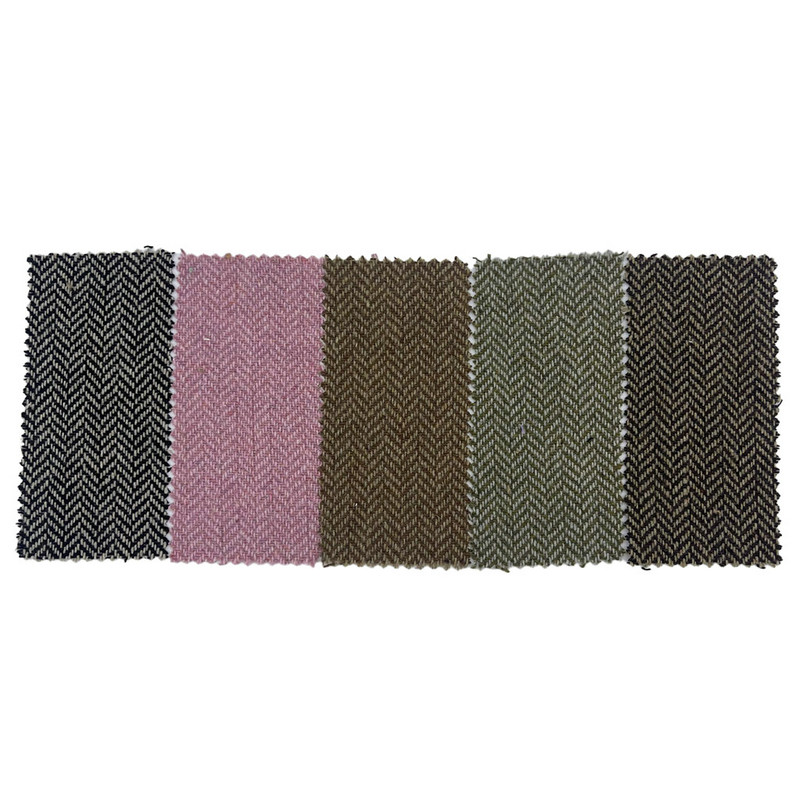 Ang telang ito, na itinalaga bilang artikulo 3532, ay isang jacquard na tela na binubuo ng 20% na lana at 80% ng iba pang mga hibla. Sa isang mass sa bawat unit area na 500 g/m, ito ay nagpapakita ng isang medium-to-heavy weight construction. Nagtatampok ang pink na ibabaw ng herringbone pattern na ginawa sa pamamagitan ng proseso ng paghabi ng jacquard, na bumubuo ng mga tiyak na hugis V na motif sa buong tela. Ang diskarteng ito ay gumagawa ng isang pare-parehong texture ng direksyon na may tinukoy na geometric na pag-uulit. Ang komposisyon ng timpla ng lana ay nakakatulong sa mga thermal properties ng tela at pagpapanatili ng hugis. Ang mga teknikal na katangiang ito ay nagreresulta sa isang materyal na may kakapalan ng istruktura at kalinawan ng pattern, na ginagawa itong naaangkop para sa pantalon kung saan ang parehong visual na kahulugan at dimensional na katatagan ay kinakailangan.