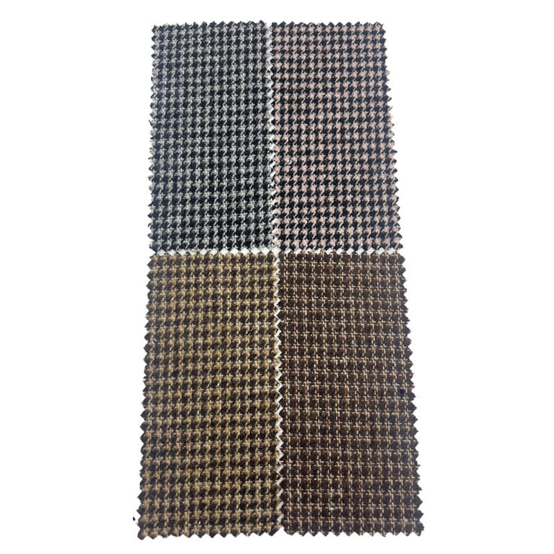 Ang telang ito, na itinalaga bilang artikulo 4334, ay isang habi na tweed na tela na binubuo ng 35% na lana at 65% na iba pang mga hibla. Sa isang masa bawat yunit na lugar na 450 g/m, ito ay nagpapakita ng katamtamang timbang na konstruksyon. Pinagsasama ng ibabaw ang isang houndstooth pattern na may mga elemento ng check, na lumilikha ng isang pinagsama-samang geometric na disenyo sa pamamagitan ng tumpak na mga diskarte sa paghabi. Ang paraan ng pagtatayo na ito ay gumagawa ng magkakaugnay na mga sirang tseke na may tinukoy na kaibahan ng kulay sa buong tela. Ang komposisyon ng timpla ng lana ay nakakatulong sa dimensional na katatagan ng tela at paglaban sa kulubot. Ang mga teknikal na katangiang ito ay nagreresulta sa isang materyal na may masalimuot na pattern articulation at structural durability, na ginagawa itong naaangkop para sa mga pantalon kung saan ang detalyadong patterning at pangmatagalang pagganap ay kinakailangan.